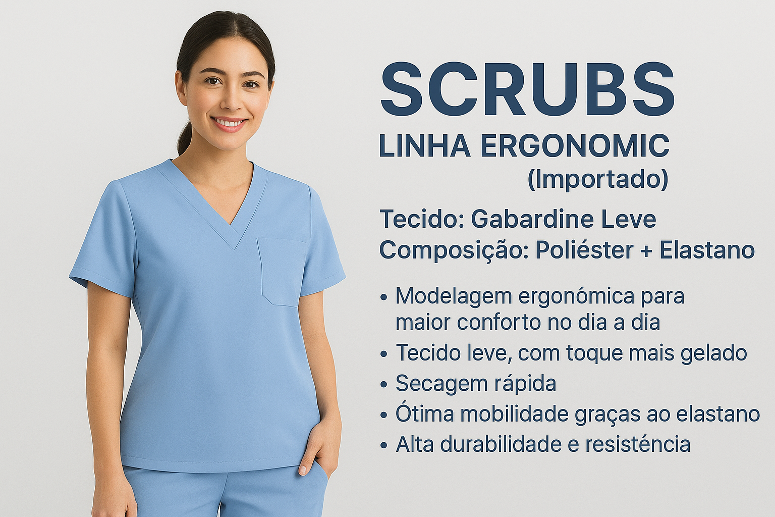 Este pijama cirúrgico da Linha Ergonomic oferece modelagem ergonômica que garante máximo conforto durante longos turnos no hospital ou clínica. Produzido com tecido gabardine leve, o material combina poliéster e elastano para proporcionar secagem rápida e excelente mobilidade. Ideal para profissionais que buscam resistência e praticidade.